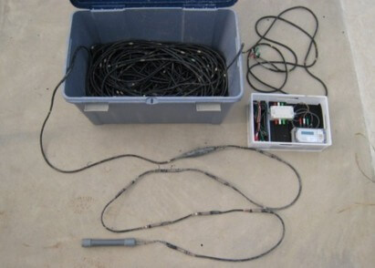 採水層やストレーナー(採水部分)の位置や長さの決定、地上や上層部の水の浸透を防ぐ遮水位置の決定に必要な地層サンプルを採取しながら行います。特に帯水層のサンプルは水質、水量予測に重要です。また、予定深度に達したら最新の電気検層器で2種類(ショートノルマル、ロングノルマル)の調査を行ない地層の対比や境界、比抵抗値を調べます。最終的に地層サンプルと電気検層データーを合わせることで最適なストレーナーの位置や長さを決めます。また、電気検層は海水による汚染も知ることできます。