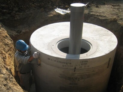 | 一般的に、井戸の上部は上の真ん中の写真のように地上に少し出た状態で仕上げますが、駐車場や通路など構造物があると困る場合は右の写真ように地中に収めることもできます。 大型(写真)~小型、手掘り井戸でも埋設できます。 ポンプ設置後、作動確認をして工事完了となります。 | ![]() | ![]() |